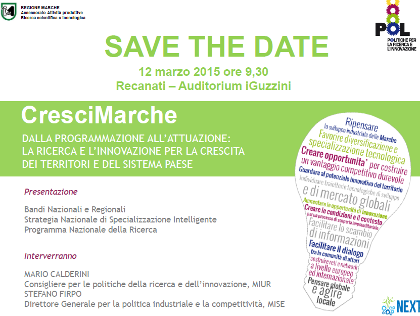 La Regione Marche organizza un evento dal titolo "CresciMarche, dalla Programmazione all’Attuazione: la Ricerca e l’Innovazione per la Crescita dei Territori e del Sistema Paese”.
