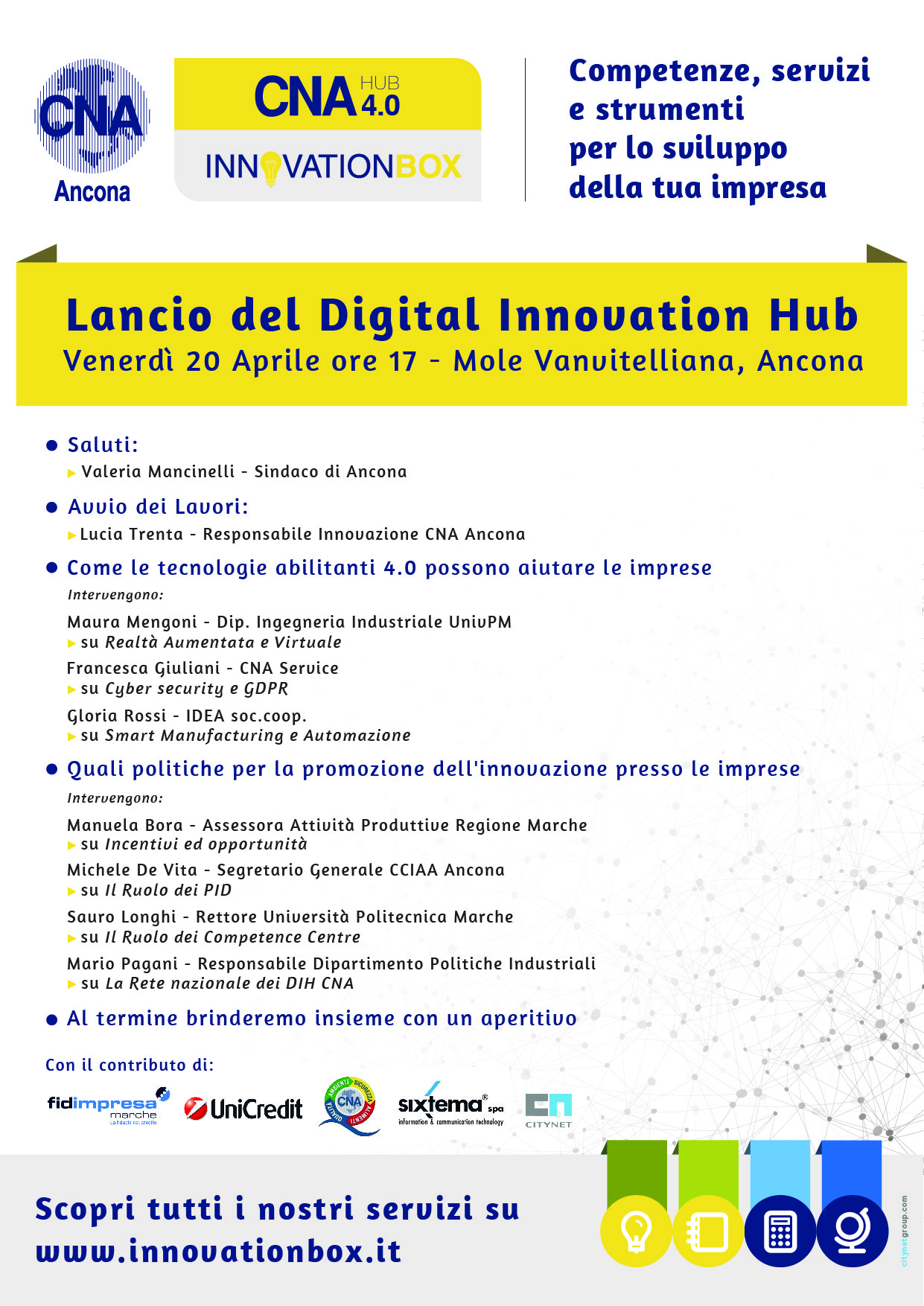Anche Cluster Marche parteciperà al lancio del Digital Innovation Hub di Cna Ancona. L'evento si terrà venerdì 20 Aprile ore 17.00 c/o Mole Vanvitelliana Ancona.