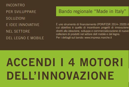 Vi comunichiamo che Unioncamere Marche, Regione Marche e ISTAO, in occasione dell'uscita del nuovo Bando POR FESR 2014-2020 "MADE IN ITALY", organizzano due incontri l'8 marzo a Pesaro (settore legno mobile) e il 9 marzo a Civitanova Marche (settore Moda) per incentivare le imprese marchigiane a sviluppare progetti di innovazione diretti alla ideazione, sviluppo e commercializzazione di nuove collezioni di prodotti nei due settori di riferimento.